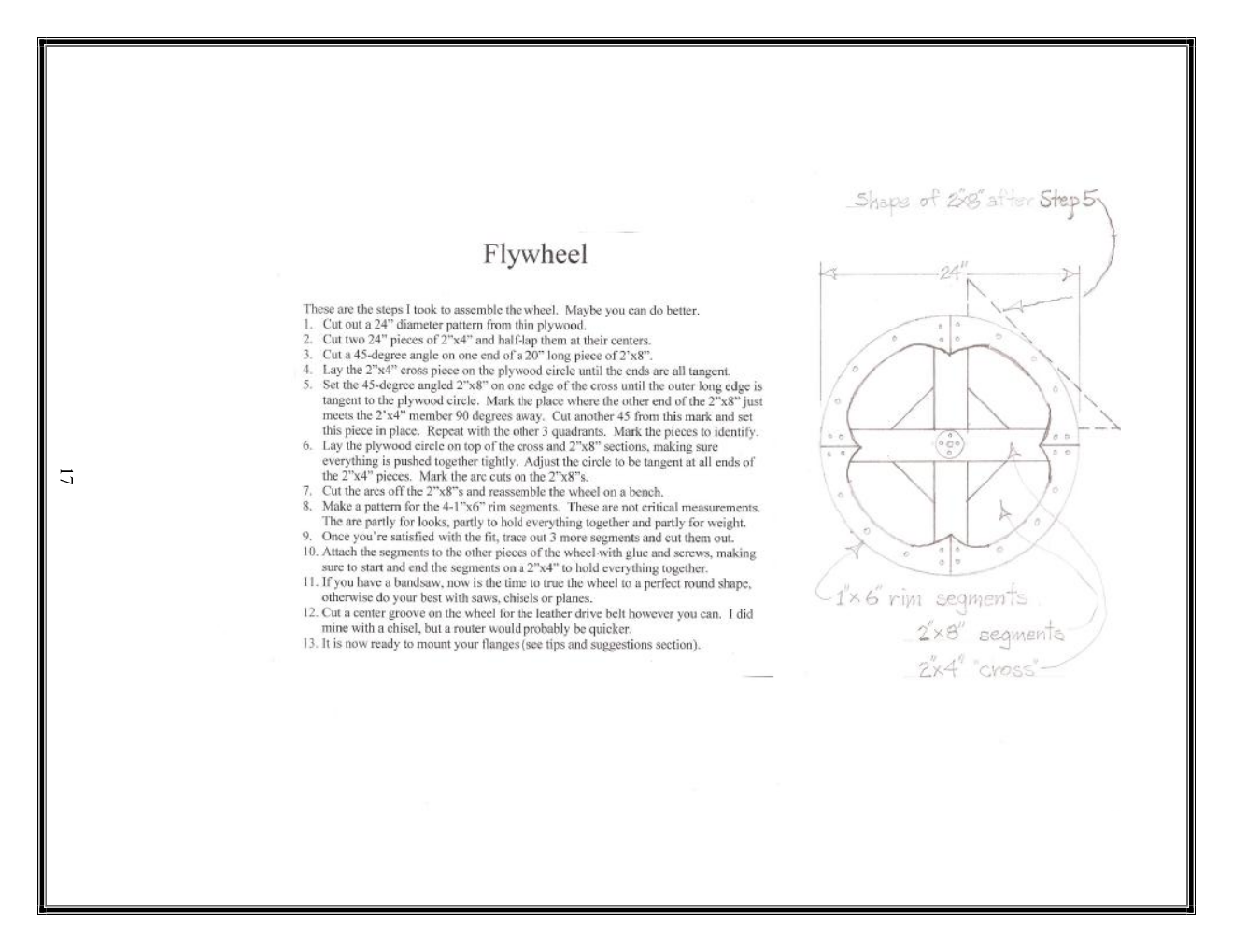 I do not have photographs of said wheel at the moment…it is resting under a pile of dimensional lumber cutoffs while I work on the rest of the frame that will support it. The one addition to this I would like to make is steel strapping around the circumference to add weight and structure. The wheel right now is probably ten or twelve pounds, which is at the very lower end of what I’d need to keep RPMs going. Adding in even 1/8” thick by 3/4” wide straps on both sides of the belt groove will add close to five extra pounds to the wheel.
